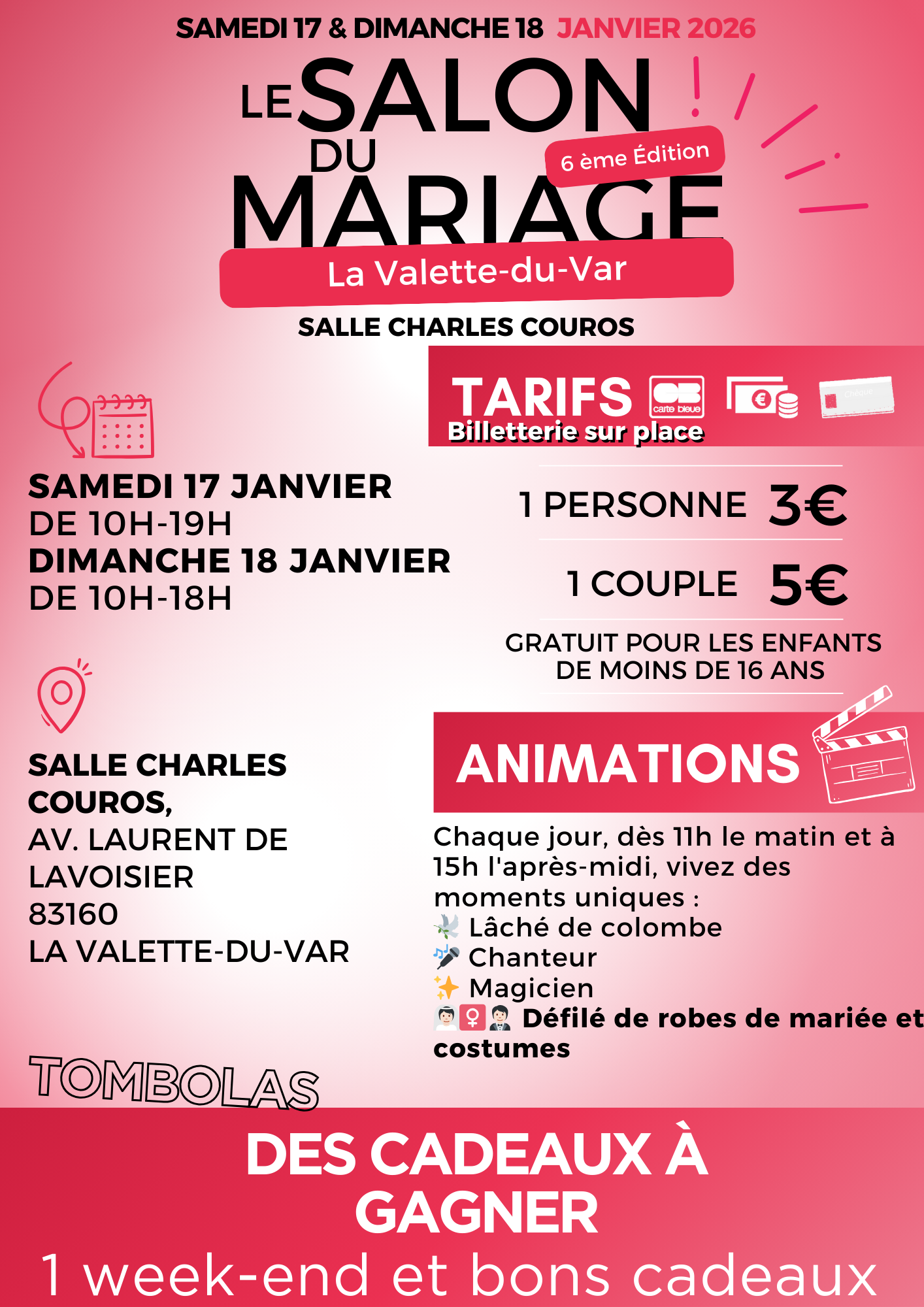 En janvier 2026, nous aurons le plaisir de vous accueillir pour la 7ème édition du Salon du Mariage de La Valette-du-Var.
